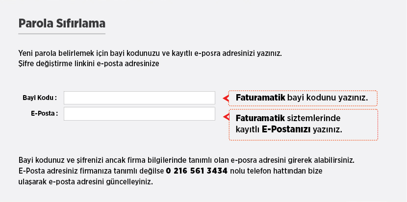 Parola Sıfırlama ekranında Bayi Kodu ve Sistemde kayıtlı olan E-mail adresinizi yazarak gönder butonuna tıklayınız ve 4.Adıma geçiniz