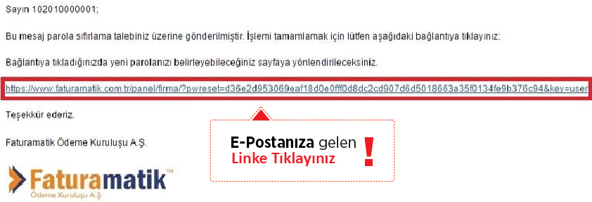 E-Postanıza gelecek olan parola sıfırlama linki aşağıda örnek olarak belirtilmiştir.