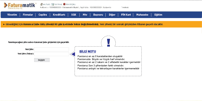 Belirlenen şifre sadece kurumsal şube girişiniz için geçerli olacaktır.